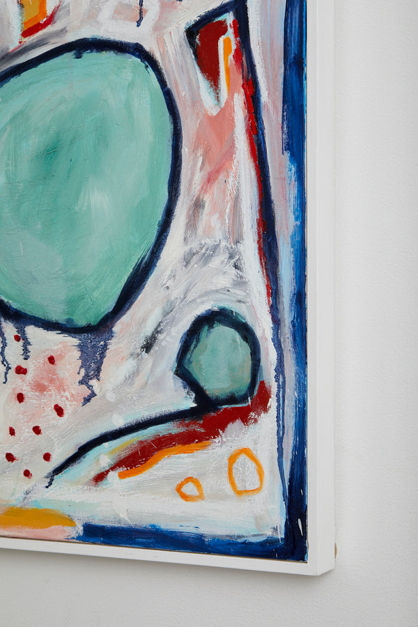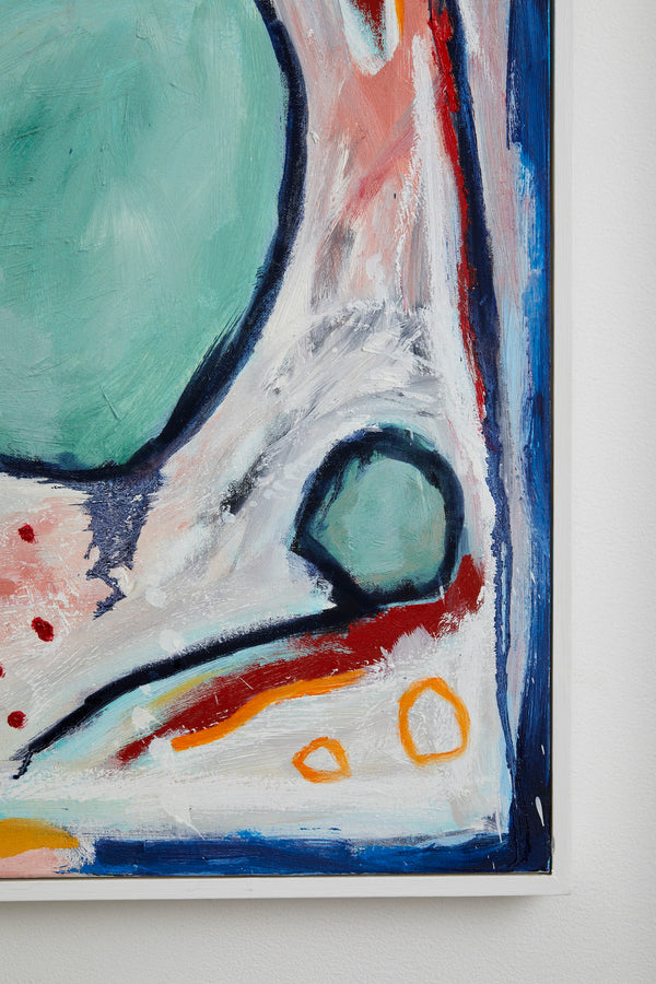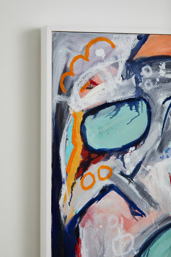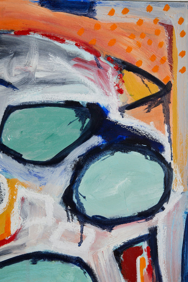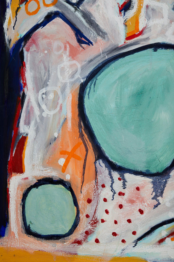 Being purposeful in promoting texture on this painting, it teases the viewers to touch the painting (when perhaps they shouldn’t) as art can be enjoyed both physically and visually. Paint is applied directly from the tube and mixed directly on the canvas. The unpredictable dynamic that follows is one that can only come with letting go and trusting the process. The use and application of an oil stick bring together the artwork, providing a new texture for the viewer.