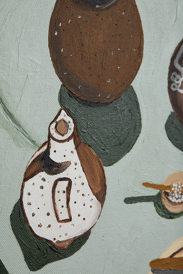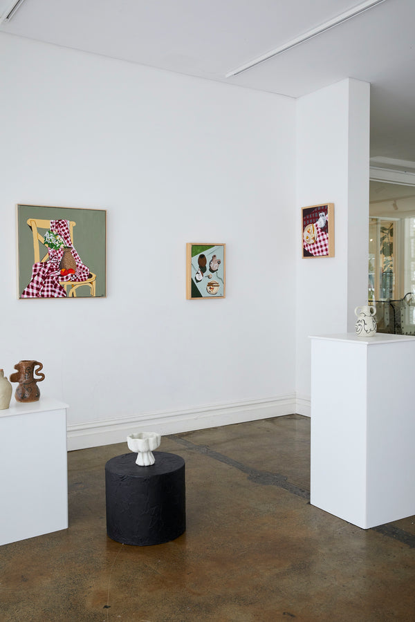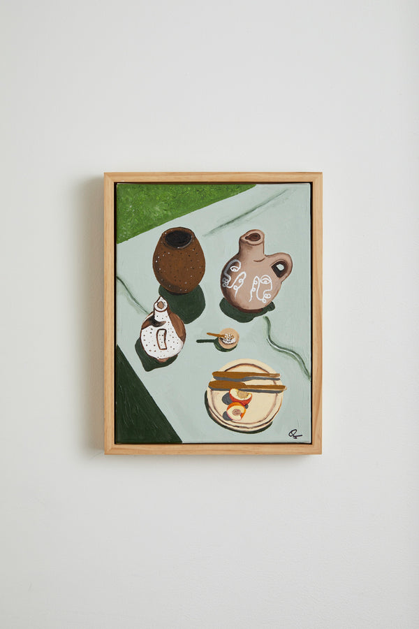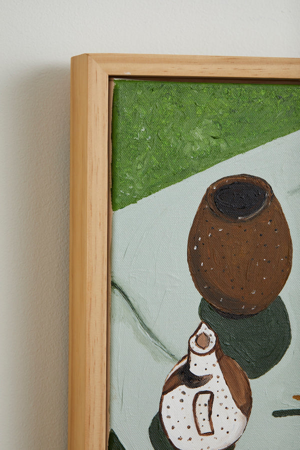I paint moments featuring my ceramics with familiar household items. My painting practice is about the reflection of my ceramics journey and the appreciation for one's home. It is a celebration of a safe space that I have created for myself.
