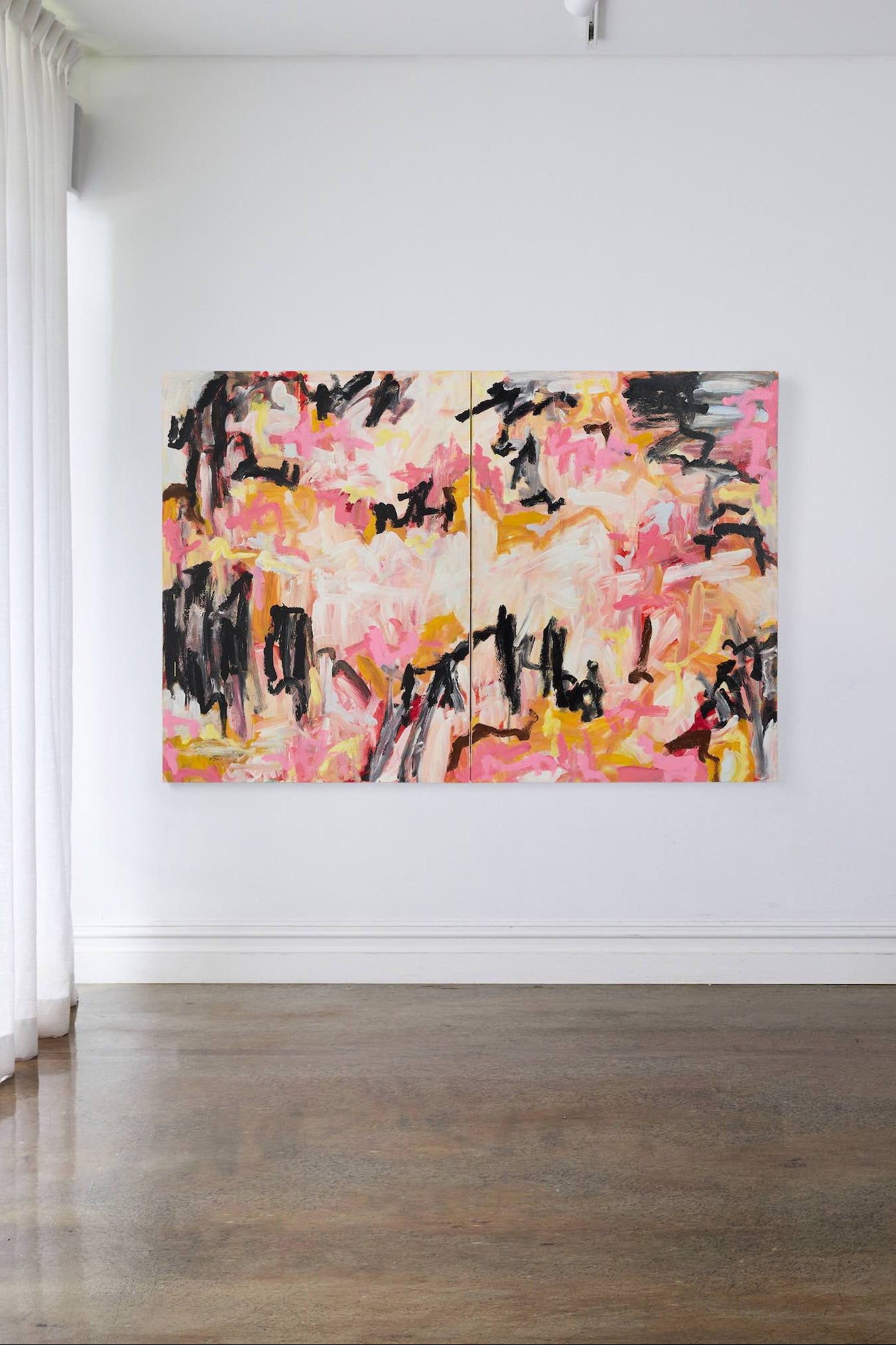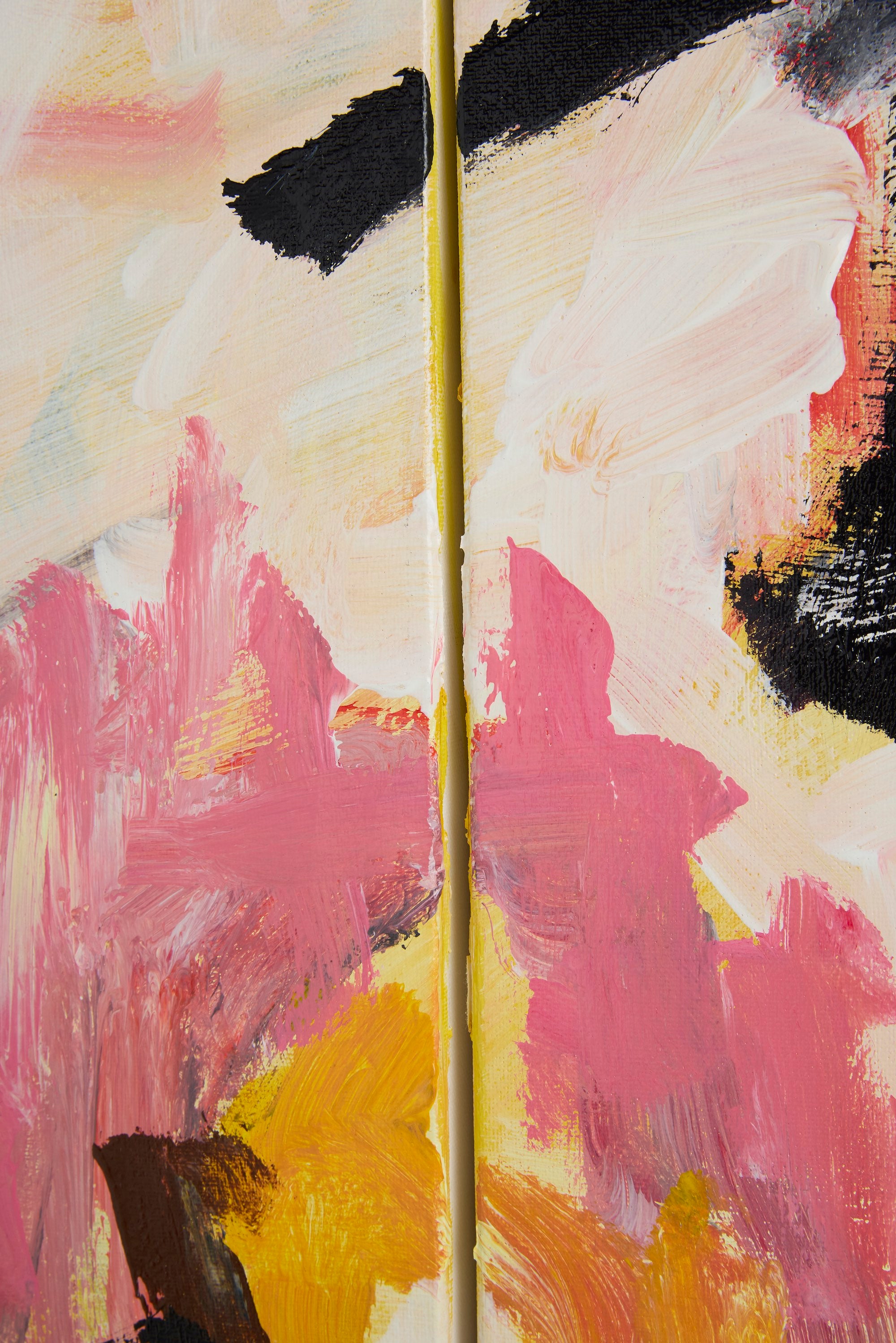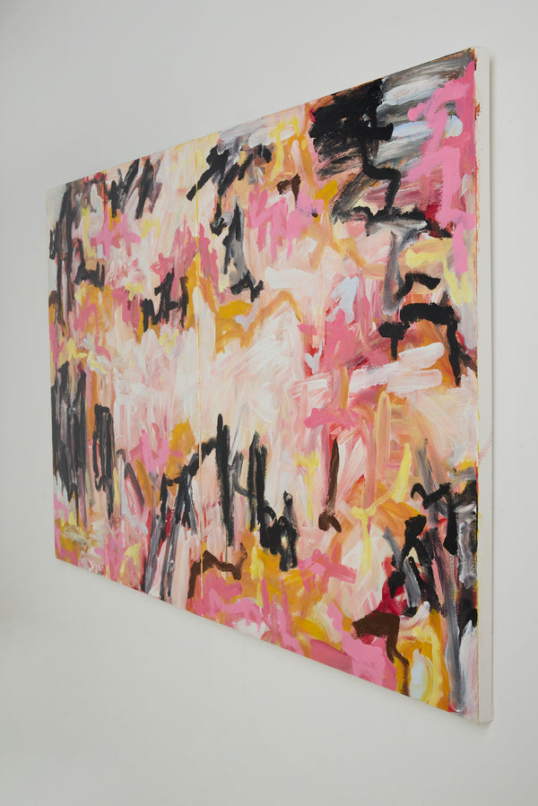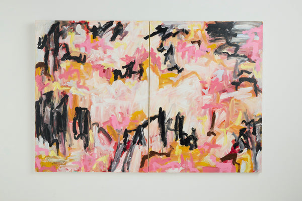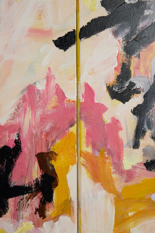 This diptych consists of two canvases designed to be displayed together. The work is delivered as two panels, with hardware included to secure the canvases together at the back.