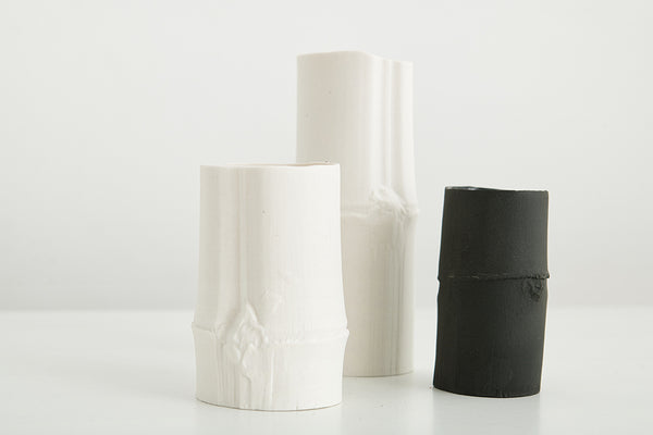 The Bamboo Range came about as a response to my application for the Itami Award, which I went on to be awarded the Itami Prize for. My idea was to create a harmonious and connected collection of vessels that in a pair, or as a larger grouping, and as multiple shapes and sizes, work together. I was naturally drawn to the inherent simplicity in the structural aesthetics of bamboo and took time to source and select specific sections I wanted to replicate and group. I am drawn to the perfect imperfection of the natural world, and the detail that can be achieved when using low relief, which allows me to capture the minimalist beauty in pure white porcelain.
