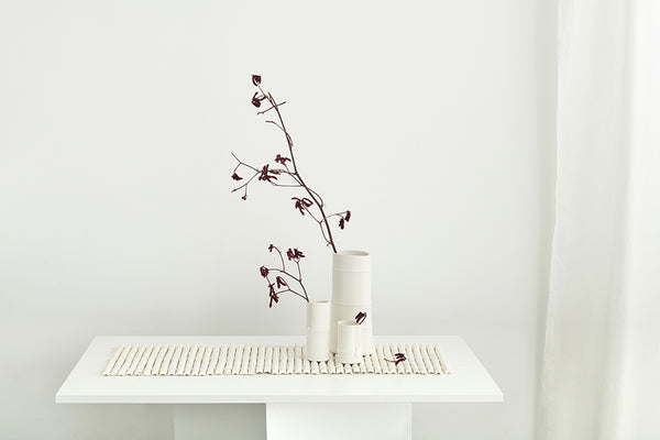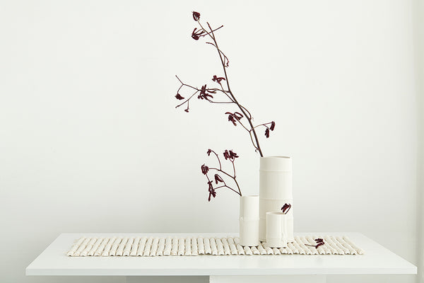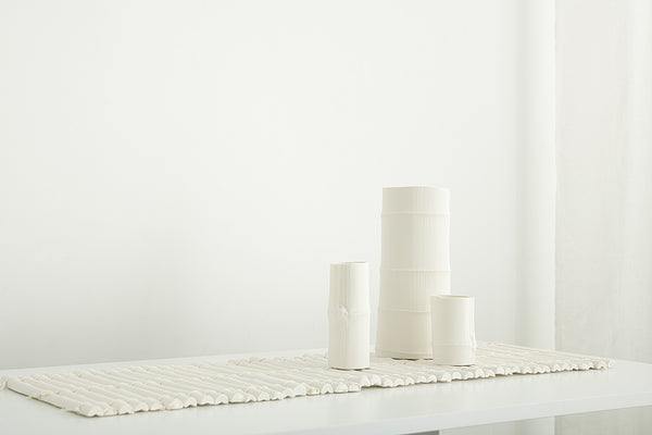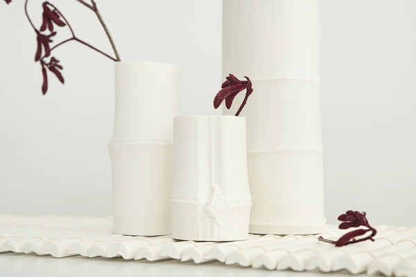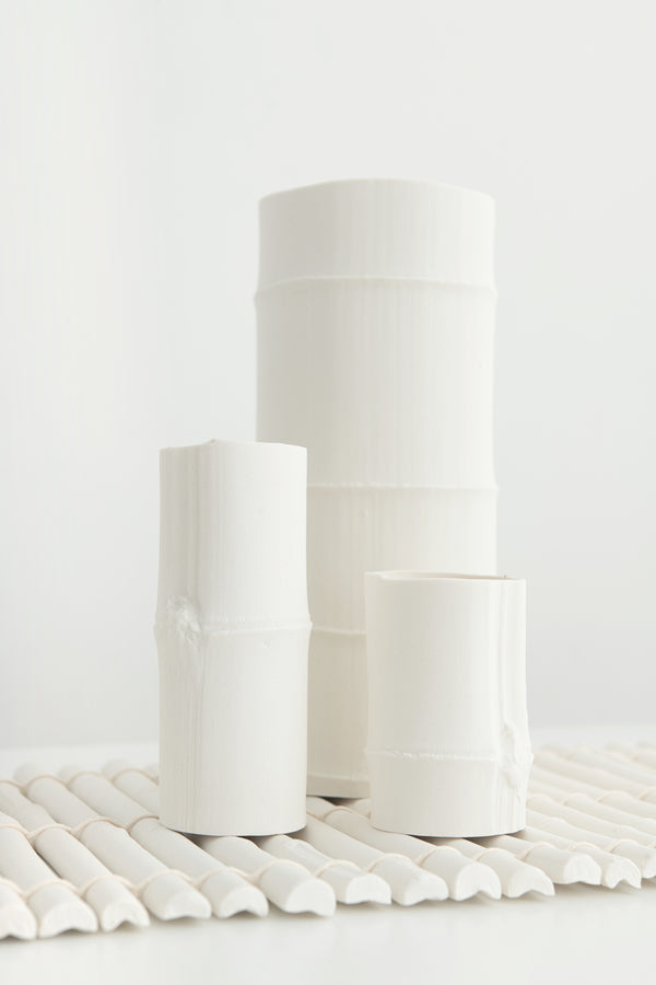 The Bamboo Range came about as a response to my application for the Itami Award, which I went on to be awarded the Itami Prize for. My idea was to create a harmonious and connected collection of vessels that in a pair, or as a larger grouping, and as multiple shapes and sizes, work together. I was naturally drawn to the inherent simplicity in the structural aesthetics of bamboo and took time to source and select specific sections I wanted to replicate and group. I am drawn to the perfect imperfection of the natural world, and the detail that can be achieved when using low relief, which allows me to capture the minimalist beauty in pure white porcelain.